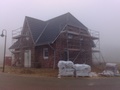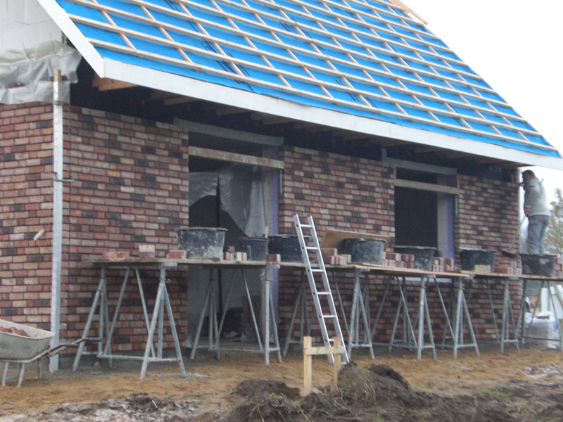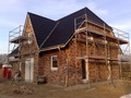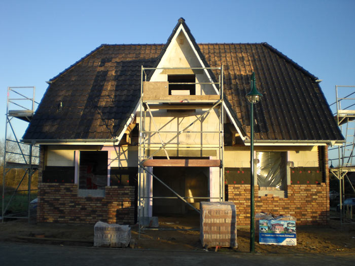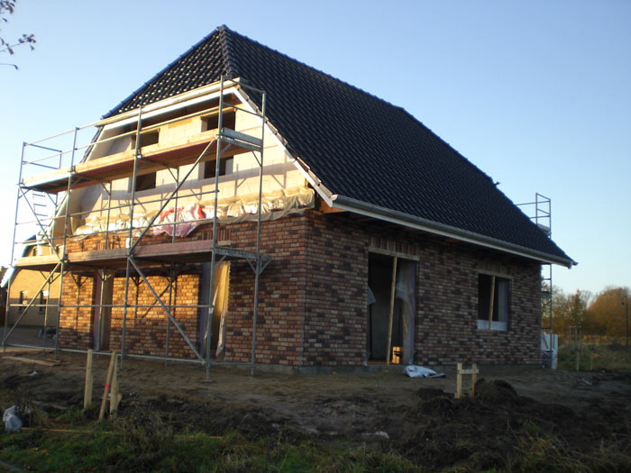 Was ist heute passiert? Die Maurer haben den Rohbau vom Frontspieß gemauert und die Gerüste an 3 Seiten aufgebaut. Drei von vier Wänden im EG sind bereits fertig verblendet. Auch die Dachdecker waren schon da und haben mit den Dachpfannen begonnen.... morgen gibt es wieder Fotos! | ||