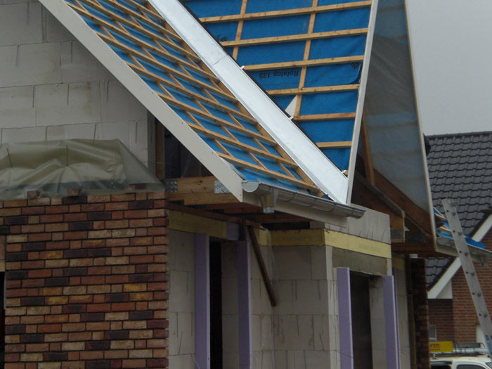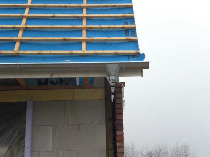 Heute waren leider keine Maurer da. Dafür haben die Dachdecker der Fa. Bartels bereits die Regenrinnen montiert... So wie es aussieht werden die Fallleitungen relativ genau über den Dehnungsfugen im Außenmauerwerk liegen. |
