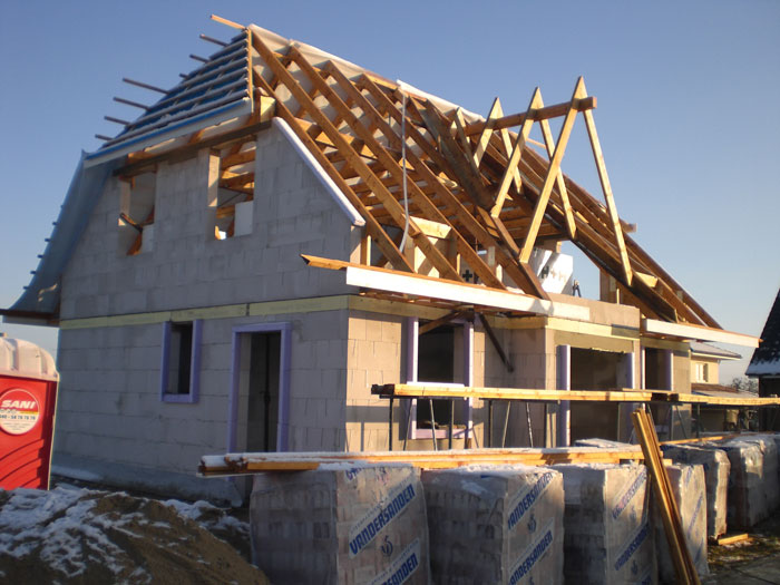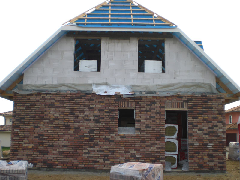 Team Massivhaus" gerne unsere Hilfe an! Das Erdgeschoß ist soweit fertig verblendet. Die erste Giebelwand ist auch schon zu 3/4 komplett. Danach fehlt nur noch die zweite Giebelwand und der Frontspieß (das ist wohl die aufwendigste Arbeit wegen den beiden Giebelohren und dem Zierband), danach die Innenwände im Dachgeschoss. Die Zimmermänner haben den Rest vom Trockenausbau Teil I erledigt. Team gibt wieder Vollgas. Ansonsten steht alles detailiert im aktuellen Bauzeitenplan. |