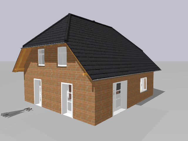 Zumindest der Verblender (Vandersanden, Ardenner Bunt) und das gesamte Außenbild hat uns gefallen. Beim Dach bleiben wir aber doch bei der Farbe schwarz (Röben schwarz-matt glasierte Tondachpfannen), die Fenster und Türen bleiben weiß (dreier Sprossenfeld oben). Links und rechts neben der Haustür gibt es jeweils auch nur ein Fenster....