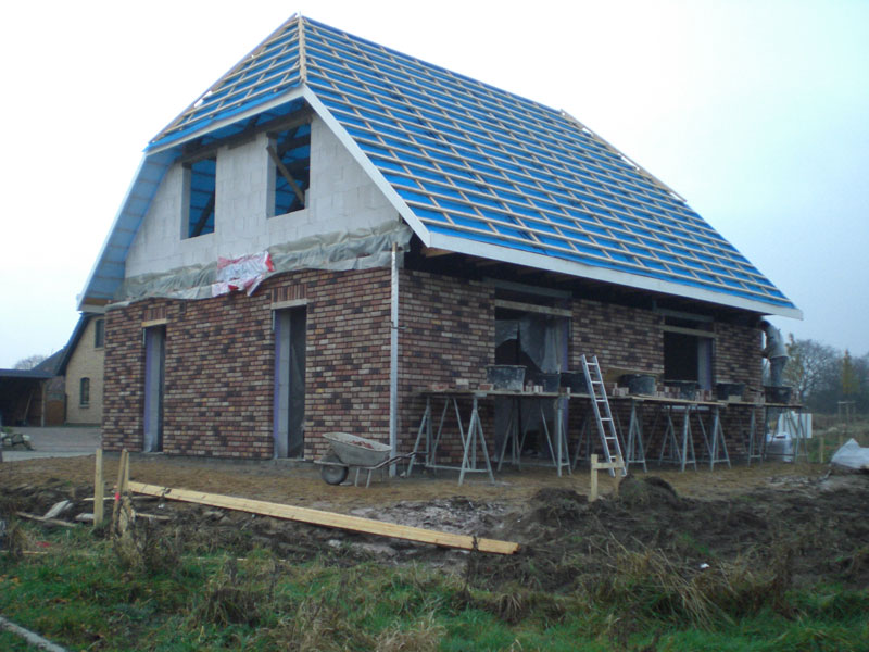 Nun gibt es auch wieder Bilder! Die Maurer und Dachdecker waren wohl heute Vormittag kurz da. Mit dem Verblenden sind sie angefangen und haben aber irgendwie nicht weiter gemacht, obwohl wir grandioses Wetter hatten. Zumindest ist das Dach fertig, drei Wochen früher als geplant... hier der -> Bauzeitenplan |