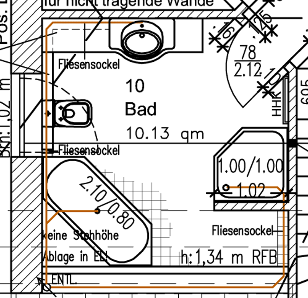 | 23.10.2008 | Hier Fotos und Grundrisse vom Bad und den Sanitärobjekten: Hier ein paar technische Detail: Badewanne: BETTE Starlett Sechseck 210x80x42 cm, Liegemaß: 1370mm, Nutzinhalt: 164l. Duschwanne: BETTE Caro Duschwanne Fünfeck, 100x100x3,5 cm, Wandauslaß mit 210mm Rainshower, Duschabtrennung: Format Express 5-Eckabtrennung, 100x100x190cm, Beschlag verchromt, FormatClean beschichtet, WC: Duravit 2nd Floor Wand-WC, Tiefspüler, Waschtisch: Duravit 2nd Floor Waschtisch geschliffen 800x500mm mit Duravit Konsolenplatte (200cm) in Ebenholz und Unterschrank, Thermostat Wannen- und Duschbatterie sowie Kopf- Duschbrausen und Waschtischarmaturen von Friedrich GROHE, Typ Senna bzw. Essence |