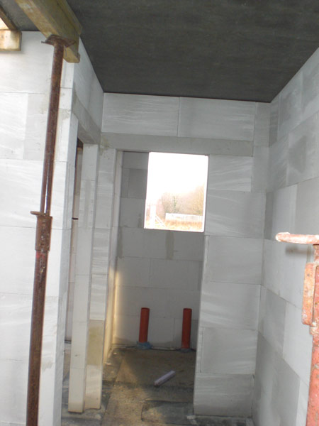 Das Erdgeschoss ist fast fertig. Es müssen nur noch einige Innenwände fertiggestellt werden und auch fehlen noch ein paar Stürze an Fenstern und Türen. Eigentlich sollten die Maurer bis Dienstagabend fertig werden. Mittwoch kommt die Betondecke. Mittlerweile kann man schon durch das Haus gehen und sich die Räume vorstellen. Bisheriges Fazit: Alles im grünen Bereich! |