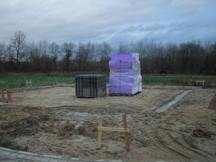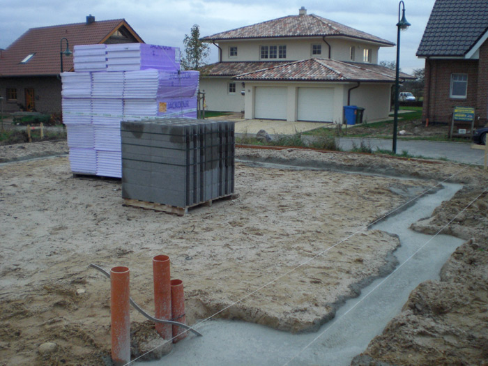 Dämmplatten für die Sohlendämmung, Bewehrungsmatten, Steine...) Die Fundamentgräben wurden mit Fertigbeton verschüttet. |